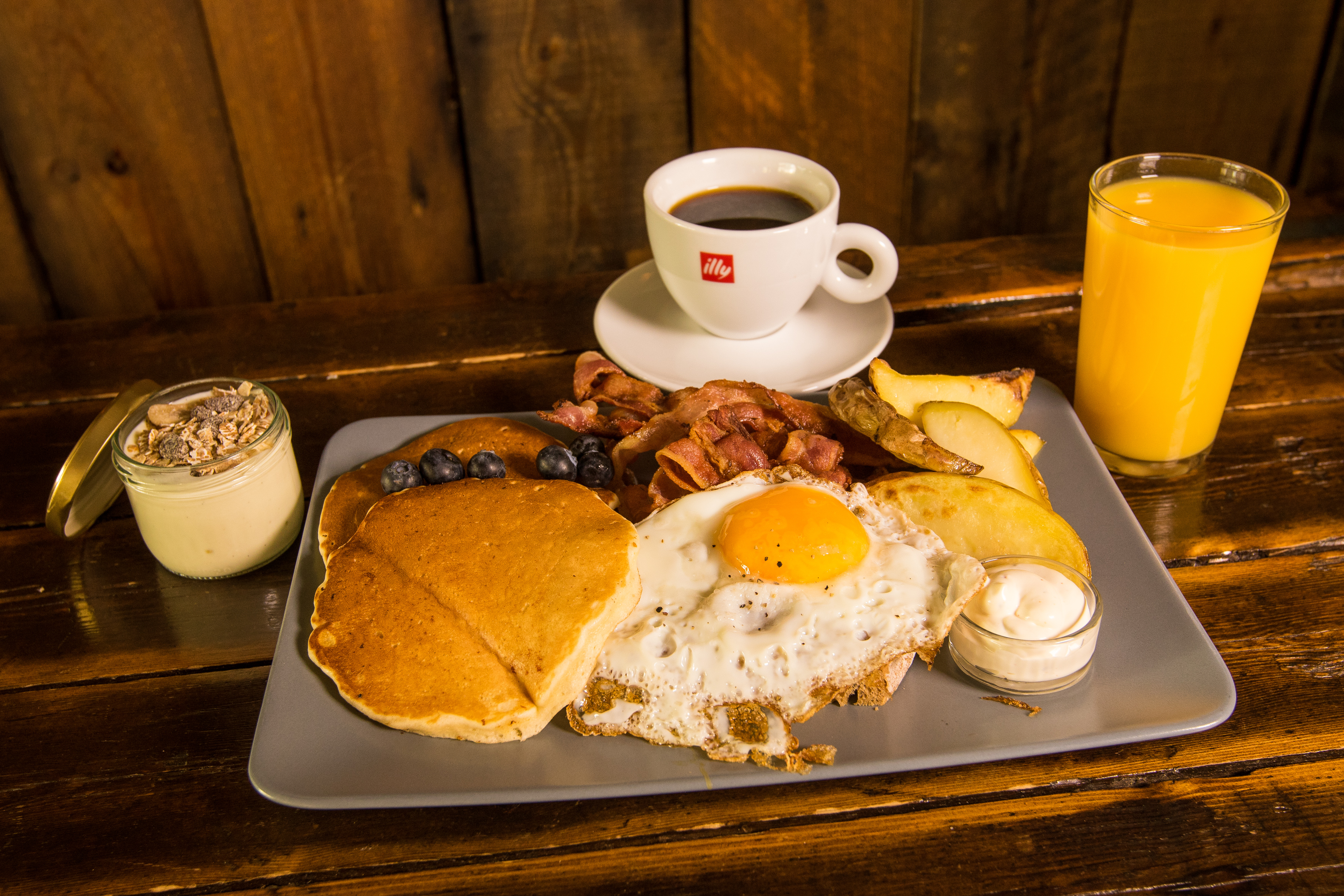 - spælt egg, beikon, pylsur, kartöflubátar, ristað brauð, skyr, pönnukökur, appelsínusafi, kaffi og te
